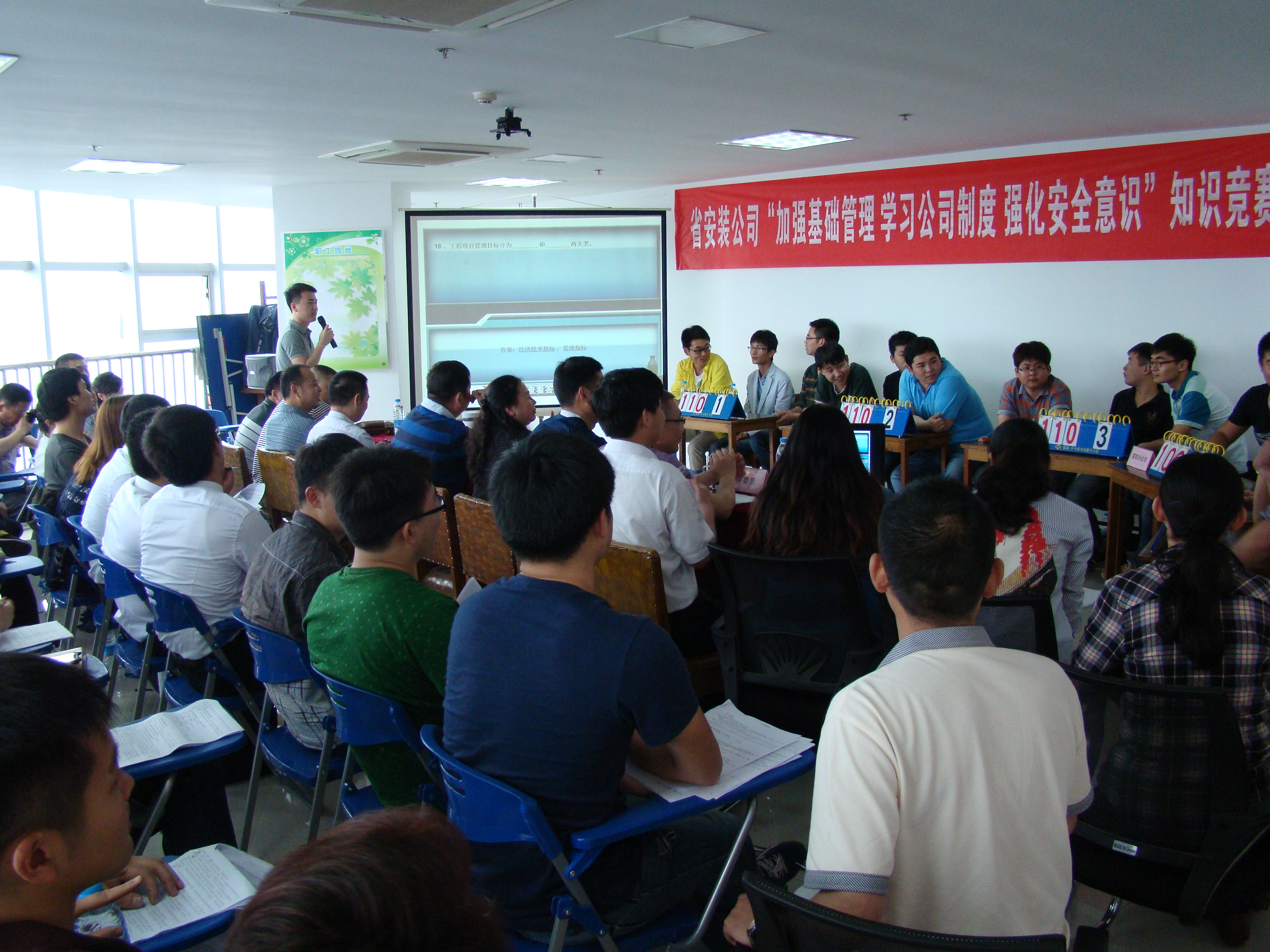為了充分展現(xiàn)職工積極好學的精神風貌,促進職工掌握企業(yè)制度和專業(yè)知識,激勵大家不斷學習、不斷進步。5月15日下午,公司在職工之家舉辦了“加強基礎(chǔ)管理、學習公司制度、強化安全意識”知識競賽。公司董事長、總經(jīng)理王軍邦,黨委副書記、紀委書記胡六中,工會主席李原到現(xiàn)場觀看比賽,并為選手們鼓勁加油。